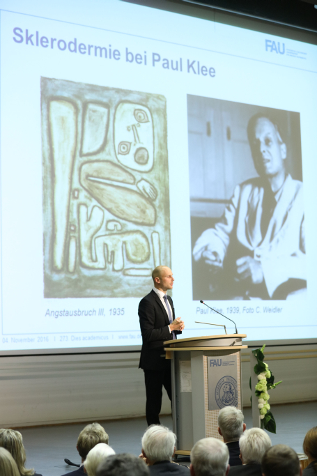 Der vom Universitätsbund Erlangen-Nürnberg gestiftete und mit 1.500 Euro dotierte Habilitationspreis wurde in diesem Jahr u.a. an einen Nachwuchswissenschaftler aus der Medizinischen Klinik 3 verliehen: PD Dr. C. Beyer erhielt den Habilitationspreis (Thierschpreis) des Universitätsbundes für seine Habilitation zum Thema „Translationale Forschung in fibrosierenden Autoimmunerkrankungen“. Fibrosierende Autoimmunerkrankungen, wie zum Beispiel die systemische Sklerose, zeichnen sich durch einen unkontrollierten Wundheilungsprozess aus, der zur Vernarbung zahlreicher Organsysteme führt und damit die Lebensqualität und die Lebenserwartung der betroffenen Patienten deutlich einschränkt. Bislang stehen keine Therapieansätze zur Verfügung, um die unkontrollierte Wundheilung zu begrenzen und die Fibrose zu hemmen oder gar rückgängig zu machen. Ein detailliertes Verständnis der molekularen Mechanismen der Fibrose erlaubt es, mögliche Ansatzpunkte für neue Therapiestrategien zu identifizieren. In seiner Habilitationsschrift stellt PD Dr. C. Beyer verschiedene molekulare Ansatzpunkte zur Behandlung von fibrosierenden Autoimmunerkrankungen vor. Dabei gelingt es ihm zusammen mit Kooperationspartnern aus der pharmazeutischen Industrie, einen Therapieansatz aus dem Labor in die klinische Anwendung zu bringen. Er lieferte molekulare Vorarbeiten, die es ermöglichen, Riociguat in einer klinischen Studie mit Patienten mit systemischer Sklerose auf seine Wirksamkeit bei der Behandlung der unkontrollierten Wundheilung zu untersuchen.