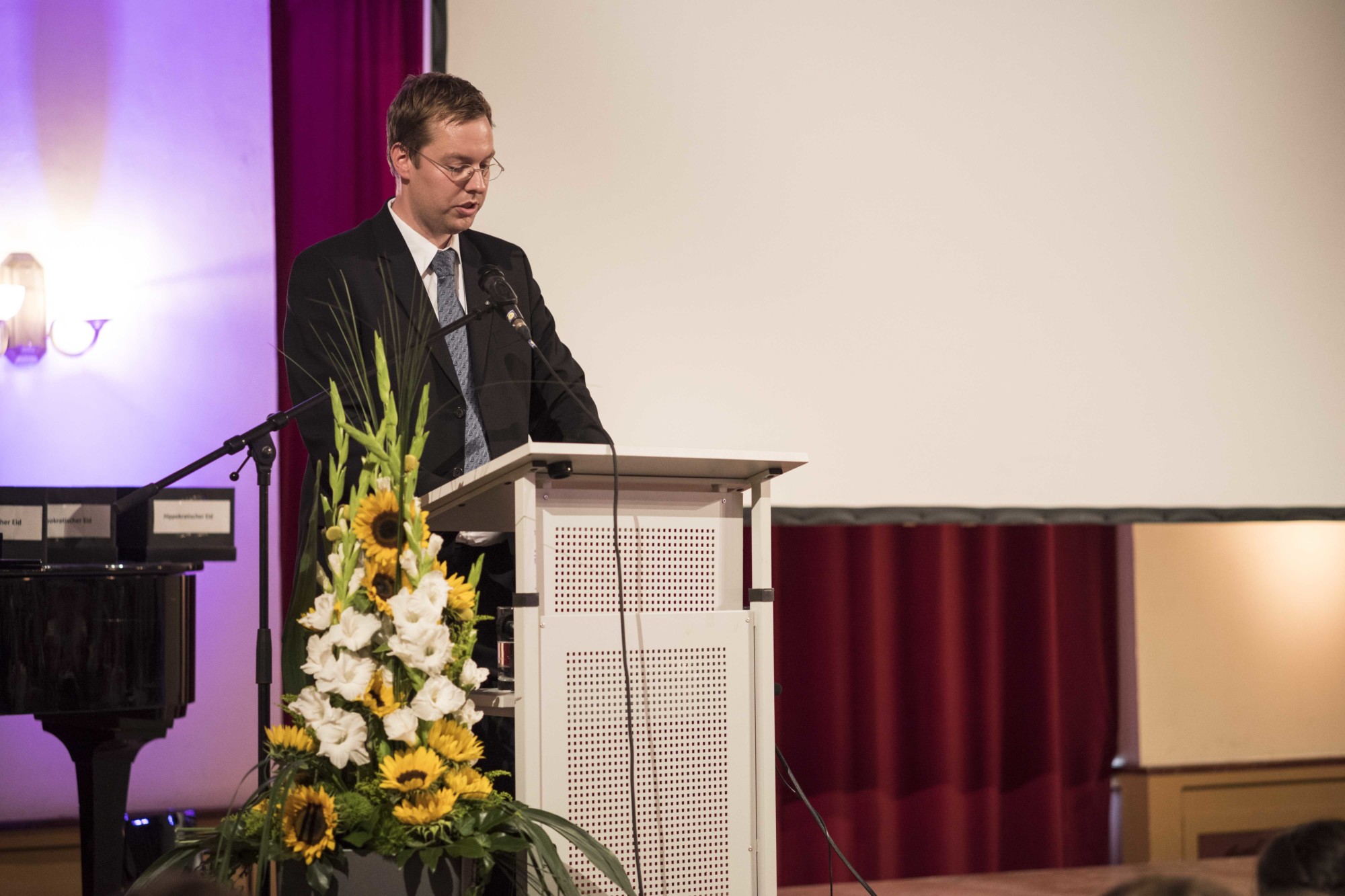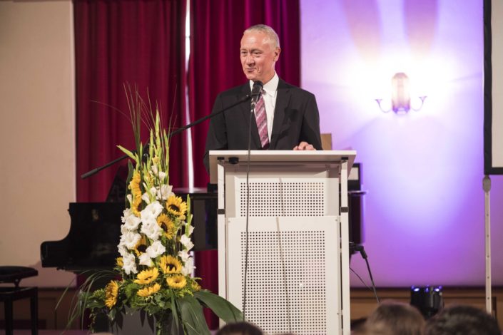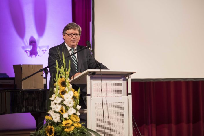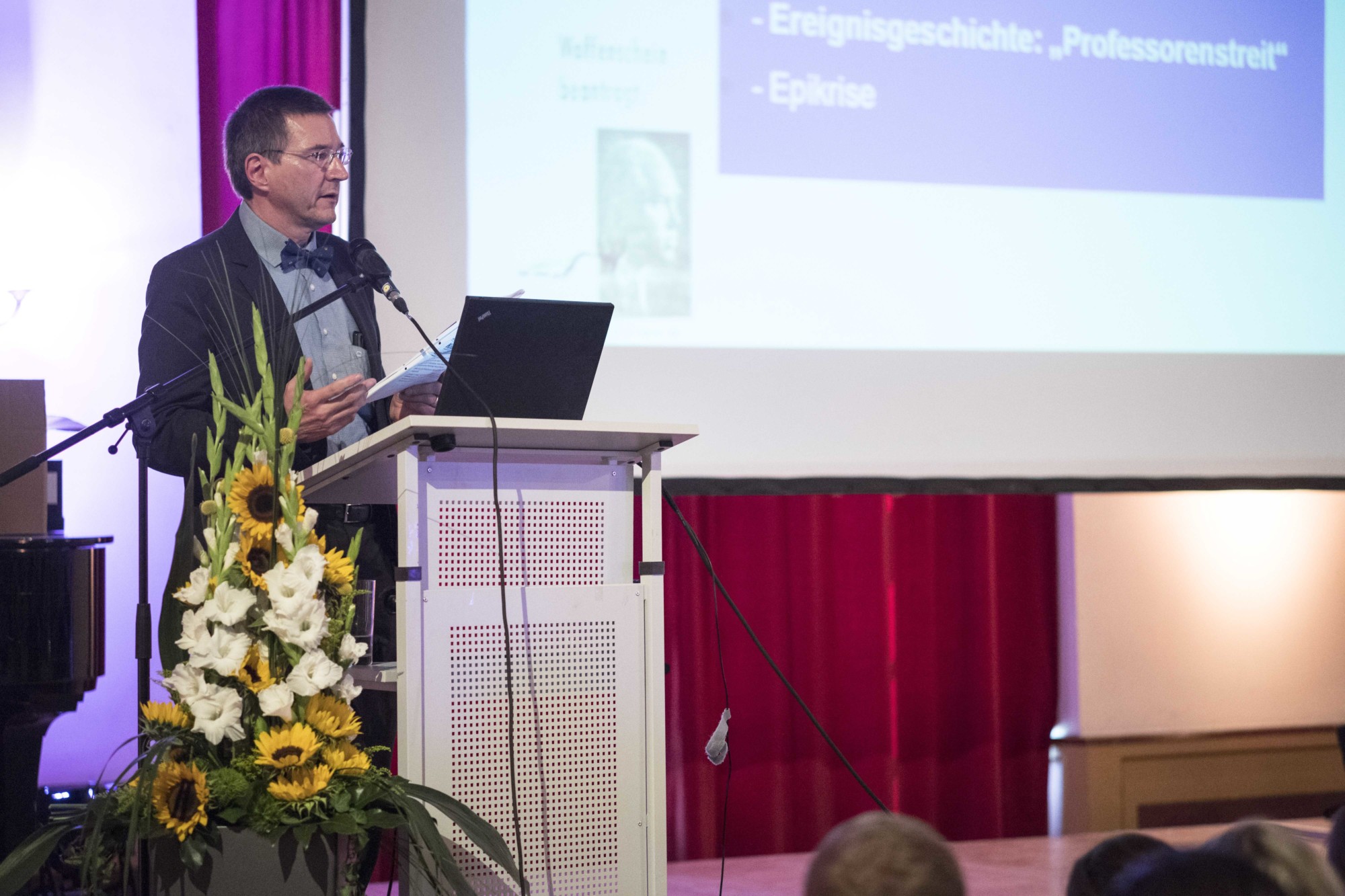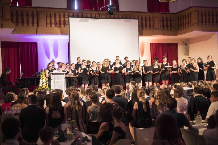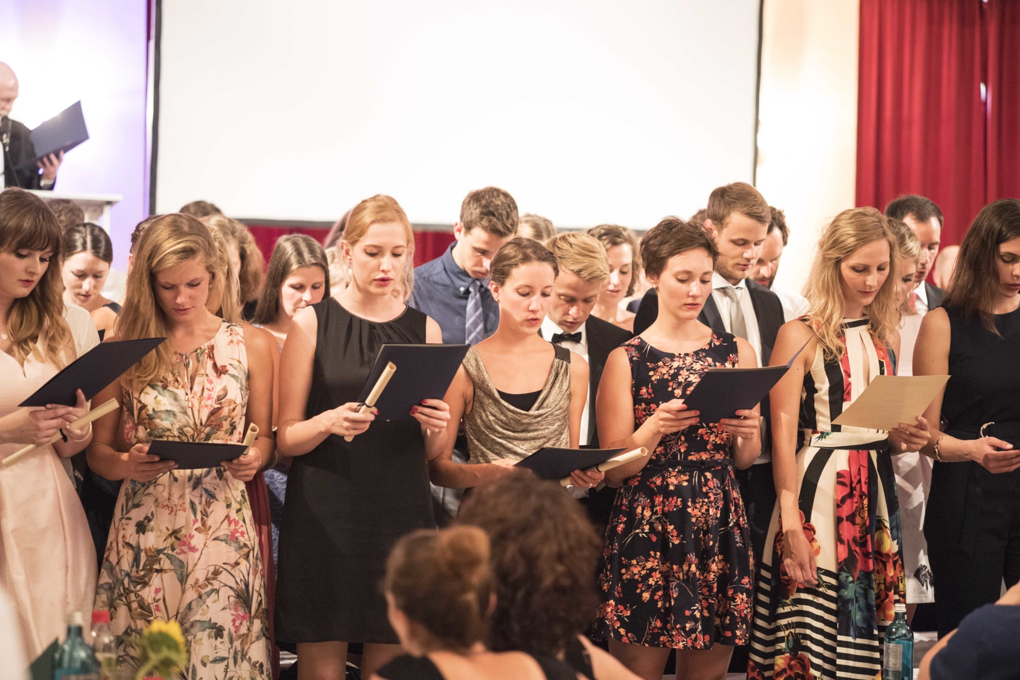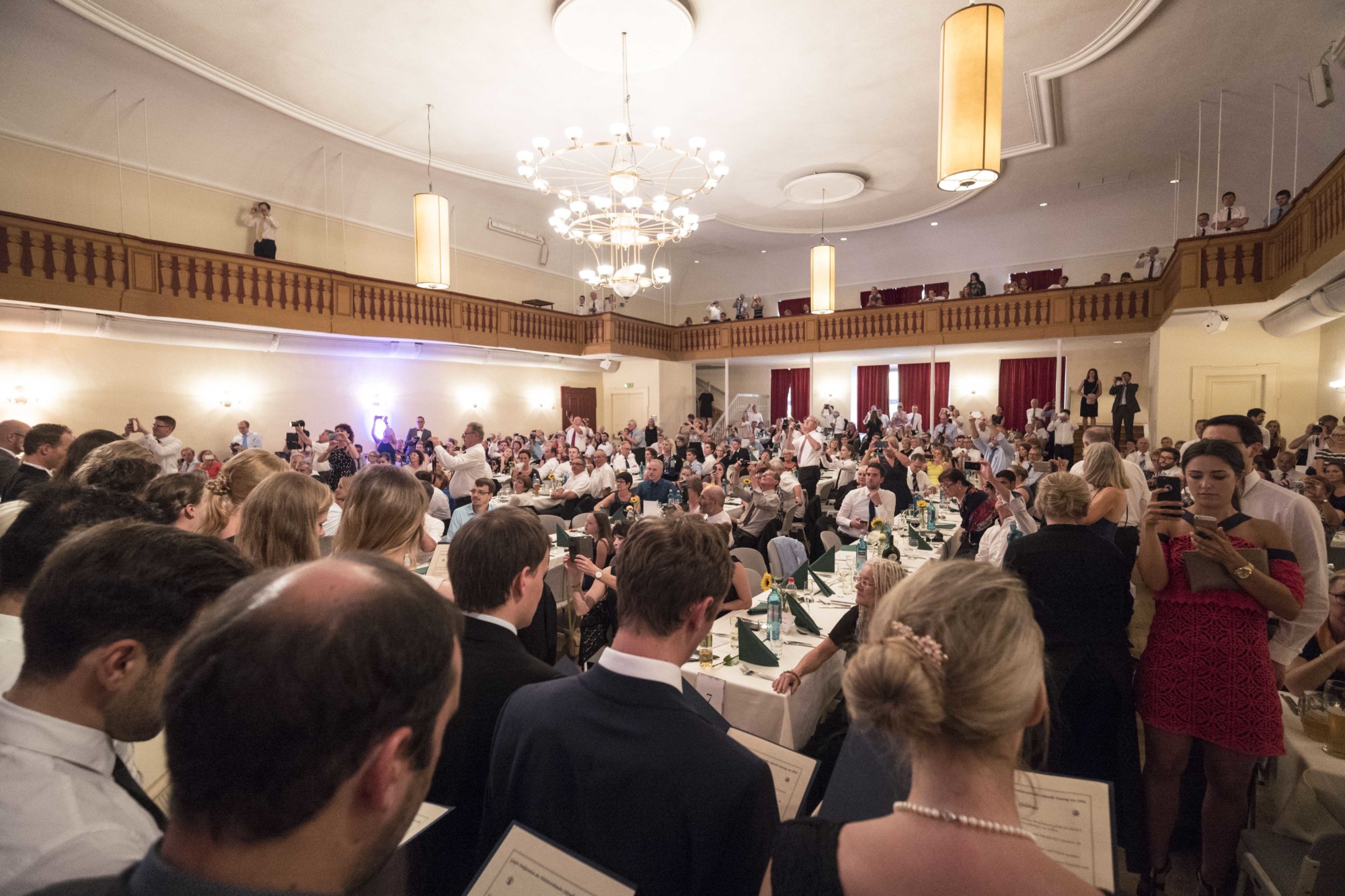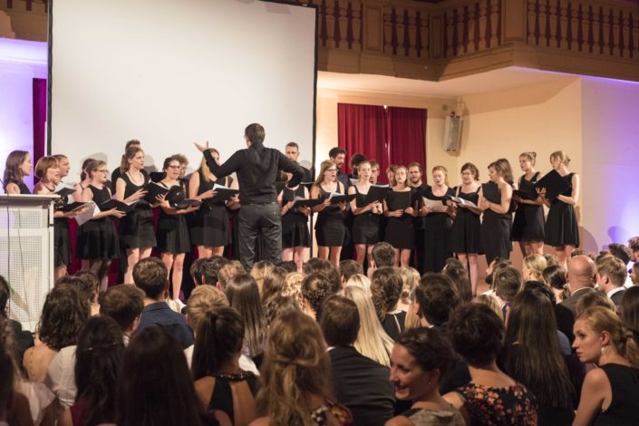 Der Beginn cum tempore, da die Reihung der einziehenden Absolventen alphabetisch, nicht nach freundschaftlicher Gruppenpräferenz wie sonst, logistisch schwieriger umzusetzen war. Schließlich der Einzug von mehr als 120 sehr ansprechend gekleideten Damen und Herren und deren Platznahme auf festlich weiß cachierten Bierbänken unter dem Applaus der Gäste und der feierlich gemixten Popmusik aus der Anlage eines exzellenten DJ. Nach dem vom Medizinerchor unter der Leitung von Dr. Johannes Havla lebhaft vorgetragenen „Rhythm of life“ und der Grußnote des Dekans, wie immer gewürzt mit kritischen Anmerkungen zu aktuellen Gesundheits- und hochschulpolitischen Fragen, die berechtigterweise mit zustimmendem Applaus (auch mit den Füßen) quittiert wurden, thematisierte der Festredner Prof. Dr. K.-H. Leven den Professoren-Waffenschein-Streit aus den 1960er Jahren. Dabei ging es ihm weniger um die Darstellung dieser „Raubersg’schicht“, sondern um die Frage, wie es sich mit der historischen Wahrheit, oder vielmehr mit dieser im Allgemeinen verhielte. Als profundem Kenner der Antike war es ihm ein Leichtes, den Bogen von Thukydides zu den fake news unserer Zeit zu spannen, und den Festgästen wird die Story vom „Huhn mit dem Gipsbein“ in Erinnerung bleiben.