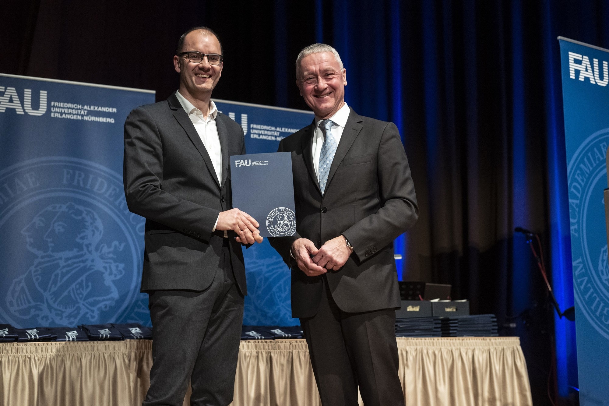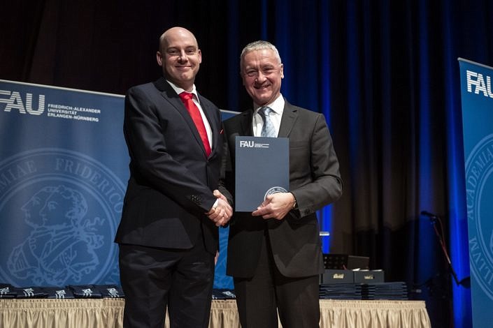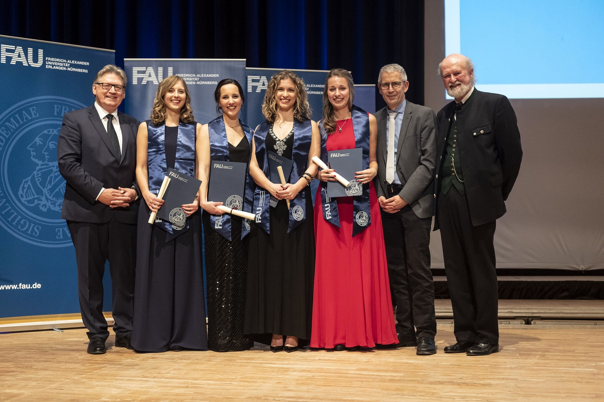Eine wohlgesetzte Rede eines soeben beglückwünschten jungen Kollegen schloss sich an, Vertreter der Fachschaft dankten ihren nun scheidenden Kommilitonen, Blumensträuße wurden überreicht, Wangen beidseitig geküsst, und die vier tüchtigen Kolleginnen des Organisationsteams bekamen aus der Hand des Alumni-Vereinsvorsitzenden je ein Exemplar der gerade rechtzeitig erschienenen Jubiläumsgeschichte unserer Fakultät überreicht, ein wahrlich gewichtiges Werk aus der Glückstraße 10. Alles wurde von Rainer Windhorst und (weil so eine riesige Location zwei Fotografen braucht) Raffael Dahl digital abgebildet, der Medizinerchor beschwor den „Rhythm of life“, und das Dinner wurde musikalisch vom bewährten Manuel Schmidtlein Trio, verstärkt durch den Saxophonisten der „Andorras“, begleitet.
