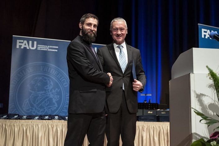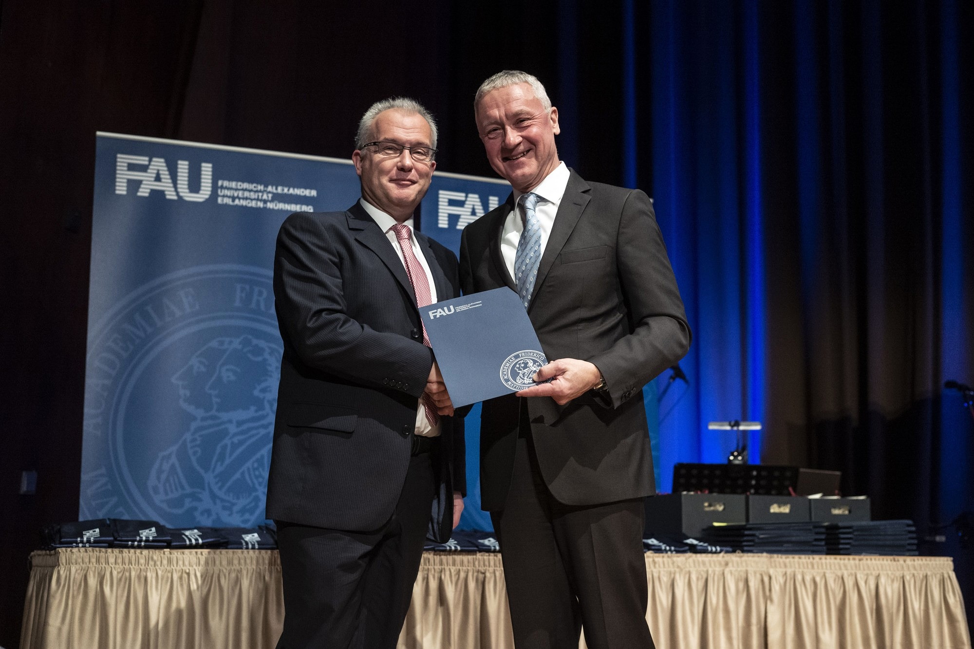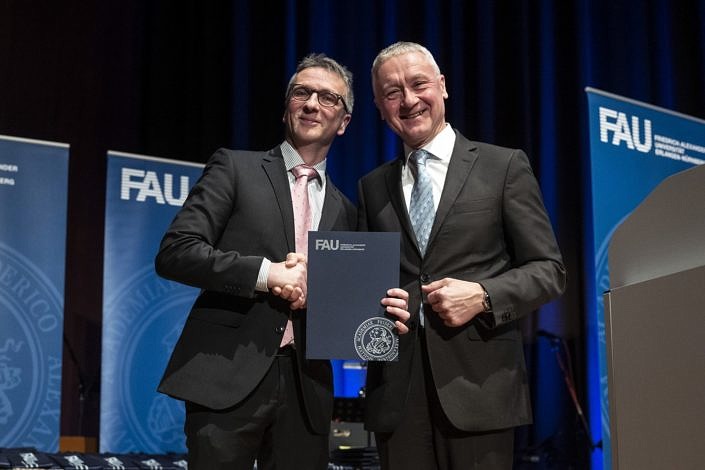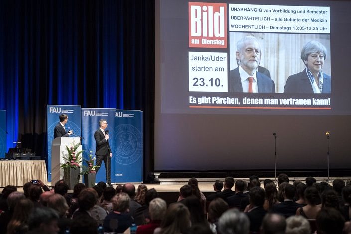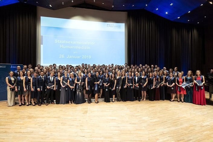 Einen ROTEN TEPPICH hatten wir an diesem Fest noch nie! Aber dieses Mal, dem ersten in der herrlichen Heinrich-Lades-Halle, wurde er unseren Absolventes und ihren Gästen ausgerollt, rest-gesponsert von der Sparkasse. Man schritt geräumig, nach Ablegen der Winterpelze in der ebensolchen Garderobe, vorbei am Bronzekopf des namensgebenden Bürgermeisters Lades zum Sektempfang an locker platzierten, weiß gehufften Stehtischen (im Redoutensaal, unserer klassischen Location, war’s neubarock gemütlich, aber a bissl eng), um Punkt (!) 18:00 Uhr (6 PM sharp!) mit dem Fest im großen Saal anzuheben. Die von der trefflichen Show- & Tanzkapelle „Andorras“ intonierte (und wegen der stattlichen Zahl der Absolventes mehrmals wiederholte) Opernball-Polonaise rief zum Einzug der festlich gewandeten Ergebnisrepräsentanten der didaktischen Bemühungen unserer Fakultät auf und begleitete ihn. In einer eleganten Y-förmig geteilten Choreographie steuerten sie von beiden Seiten die in der Mitte des mit geknickt vorspringenden Mahagoniplatten getäfelten großen Saals (eine auch heute vortrefflich zu ertragende Stilistik der 1970er Jahre) angeordneten kardinalrot tapezierten (der Bamberger Bischof hätte seine Freude!) Stühle an und nahmen, eine nach dem andern, auf denselben Platz. Johannes Havlas Medizinerchor, konstitutioneller Bestandteil dieser Feier seit vielen Jahren, stimmte uns alle ein, die Grußworte unseres Dekans klangen freudiger denn je, und der grußüberbringende Vertreter der Bayerischen Landesärztekammer beglückwünschte den Dekan zu diesem wahrlich unvergleichlichen Ambiente. Herr Hauke, unser langjähriger Florist, hatte nämlich in visionärer Intuition den Blumenschmuck am Rednerpult und auf den Tischen farblich mit der Bestuhlung abgestimmt, ohne diese vorher gesehen zu haben. Zwischen Mauve und Kardinalsrot changierend, passte dieses Dekor vortrefflich zur Mahagonitäfelung.