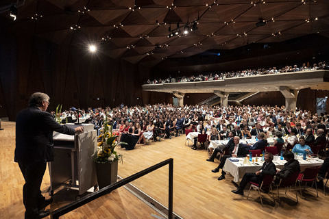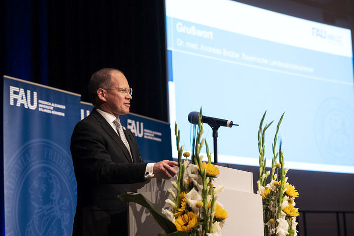 Unser Dekan, der sich sichtlich freute, mit seiner 22. Begrüßungsrede seine lange Amtszeit zu krönen, gab den jungen Kollegen (die selber in ihren Reden auf das umständliche Gendern verzichteten) neben seinen Glückwünschen viel Ermunterndes mit auf den Weg, und Herr Kollege Botzlar tat es ihm in seinem Grußwort der Bayerischen Landesärztekammer gleich. Der Saal war bis zur Empore hinauf voll besetzt mit glücklich strahlenden Groß- und Eltern, Ehe- und sonstigen Partnern, Freunden und Nachwüchsen, auch der Tisch mit den Ehrengästen war länger als sonst, da vor allem etliche Lehrpreisträger und auch andere Kollegen aus der Fakultät sich eingefunden hatten.