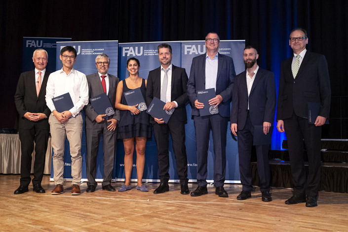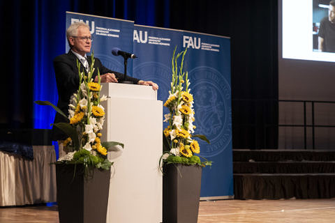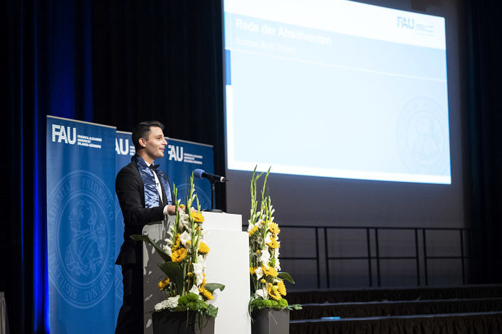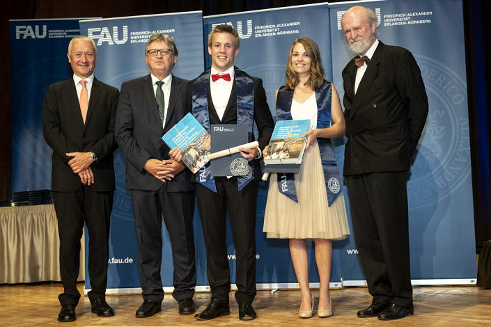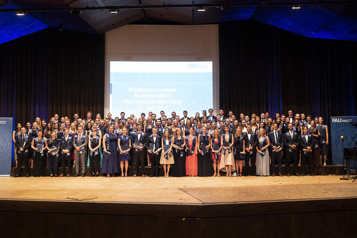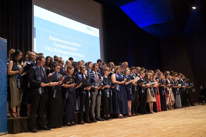 Die Überreichung der Festurkunden, des Hippokratischen Eides und das Schmücken jeder Absolventin und jedes Absolventen mit einer dunkelblauen seidenen FAU-Stola gelang den drei Akteuren: Dekan, Studiendekan und dem Verfasser dieses Berichts sehr zügig dank der vorbereitenden Assistenz vom Kollegen Kaufmann aus der Fachschaft, wie gleichermaßen der gesamte Festablauf durch die vom Kollegen Reckziegel gesteuerte Powerpoint-Präsentation vortrefflich strukturiert war. Zuvörderst wurde das tüchtige Orga-Team geehrt, gefolgt von zwei Absolventen (1w/1m), die ihr Examen mit der Note 1,0 absolviert hatten und zur zusätzlichen Festigung ihrer Verbundenheit mit der Fakultät mit dem 275er Jubiläumsband beschenkt wurden. Die Deklamation der Genfer Deklaration des Weltärztebundes duch die fast 120 neuen Mitglieder der Landesärztekammer bildete den feierlichen Abschluss dieses Aktes.
