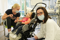 Was auf Lisas Diagnose im Februar 2020 folgte, waren zunächst drei Dosen des seit 2017 zugelassenen Medikaments Spinraza im Abstand von jeweils zwei Wochen und eine weitere im Mai 2020. Von SMA betroffene Kinder erhalten diesen gentherapeutischen Ansatz per Lumbalpunktion, also direkt ins Nervenwasser. „Das Problem dabei ist, dass für die exakte Verabreichung eine medikamentöse Narkose erforderlich ist – das ist gerade bei muskelschwachen Kindern mit besonderen Risiken verbunden“, sagt Prof. Trollmann. „Außerdem müssen wir die Punktionen bei Kindern mit Skoliose, also mit Wirbelsäulenverkrümmungen, unter radiologischer Kontrolle durchführen.“ Lisa wurde das Präparat Spinraza im Alter von sieben bis neun Monaten jeweils unter Narkose und stationärer Überwachung verabreicht – bis ihr schließlich Anfang Oktober 2020 eine Infusion mit dem erst seit 1. Juli 2020 in Deutschland zugelassenen Medikament Zolgensma angeboten werden konnte. „Dabei reicht eine einzige Dosis des neuen Gentherapeutikums aus. Dank Zolgensma produziert jetzt jedes Motoneuron in Lisas Körper das fehlende SMN-Protein, sodass ein vorzeitiger Abbau dieser Nervenzellen verhindert wird und die Muskelkraft sich verbessern kann“, erklärt Prof. Trollmann. „Wir hatten dabei maßgebliche Unterstützung von unserer Apotheke hier am Uni-Klinikum. Die Therapie mit Zolgensma kann nur an universitären Einrichtungen und in spezialisierten Muskelzentren angeboten werden, da es ausschließlich diesen möglich ist, die notwendigen Vorbereitungen sowie die spezielle Überwachung und Nachsorge durchzuführen.“