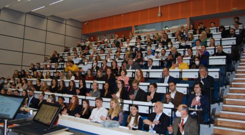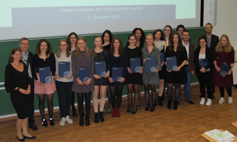 Nach zwei Jahren Pandemie-bedingter Pause fand die feierliche Verleihung der Abschlussurkunden und Preise endlich wieder in Präsenz statt. Entsprechend groß war die Resonanz! Der Prodekan der Medizinischen Fakultät, Professor Dr. Thomas Brabletz, begrüßte die etwa 200 Gäste denn auch sichtlich beeindruckt: einen so voll besetzten Hörsaal habe selbst er als erfahrener Hochschullehrer lange nicht erlebt!
