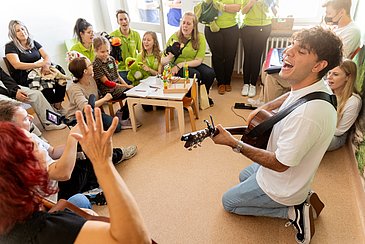 Über vier Stunden lang sangen die Musikerinnen und Musiker in den Räumen und auf den Fluren der Kinderklinik ihre Hits – begleitet von den ehrenamtlichen Mitarbeitenden des Kinderklinikkonzerte e. V., die im Takt der Musik farbenfrohe Handpuppentiere tanzen ließen. Leise Balladen – darunter Sophias „Schmetterling“ mit Liedzeilen wie „Und ja, ich weiß, es ist nicht immer leicht für dich“ – sorgten für Gänsehaut und Tränen der Rührung, während schnelle Pophits wie Gregor Hägeles „Zuckerschock“ alle Anwesenden zum Mittanzen, -singen und -klatschen brachten.