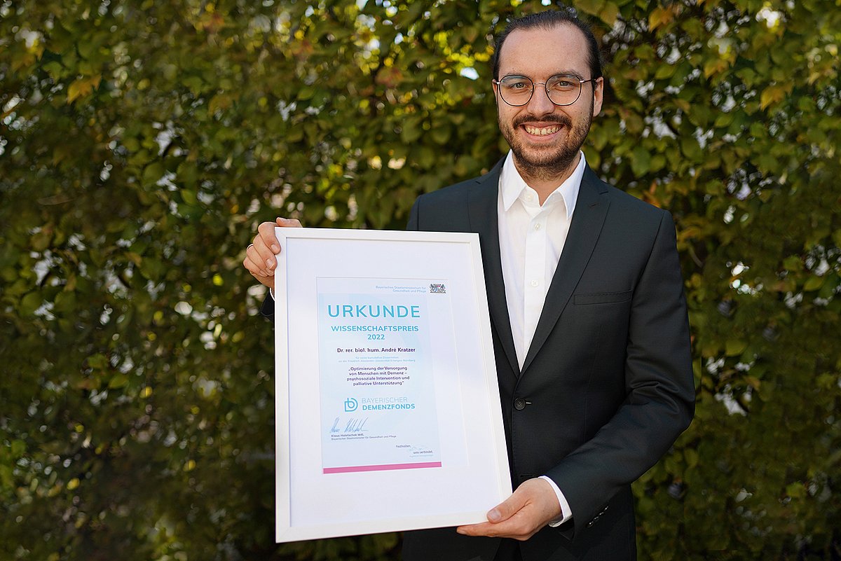 Durch die ausgezeichnete kumulative Dissertation des Psychologen Dr. André Kratzer mit dem Titel „Optimierung der Versorgung von Menschen mit Demenz – psychosoziale Intervention und palliative Unterstützung“ konnten erstmals für Bayern wichtige empirische Daten zur Versorgungssituation von Menschen mit Demenz in der letzten Lebensphase im häuslichen Umfeld gewonnen und Empfehlungen daraus abgeleitet werden. Zum anderen beschäftigte sich die Arbeit mit der Weiterentwicklung der wirksamen MAKS-Therapie, damit auch die in ambulant betreuten Wohngemeinschaften lebenden Menschen mit Demenz von den positiven Auswirkungen der in Pflegeheimen sowie Tagespflegen bereits erprobten psychosozialen MAKS-Therapie profitieren können.