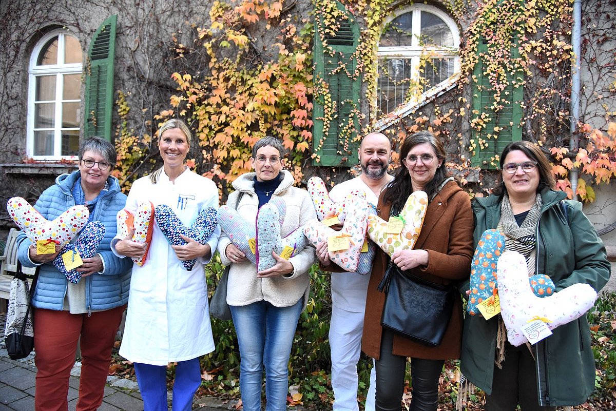 Mehr als 180 Kilometer kamen vier Mitglieder des Frauenbunds Dasing aus dem schwäbischen Landkreis Aichach-Friedberg angereist, um der Frauenklinik (Direktor: Prof. Dr. Matthias W. Beckmann) des Uniklinikums Erlangen über 100 handgenähte Herzkissen zu spenden. PD Dr. Carolin C. Hack, stellvertretende Direktorin der Frauenklinik, und Physiotherapeut Mario Witter nahmen die bunten Unikate von Heike Widmann, Sandra Treffler, Carola Kreutmayr und Carmen Huber dankbar entgegen. Die Kissen in Herzform dienen Frauen nach einer Brustkrebsoperation zur Entlastung des Arms und zur Schmerzlinderung.