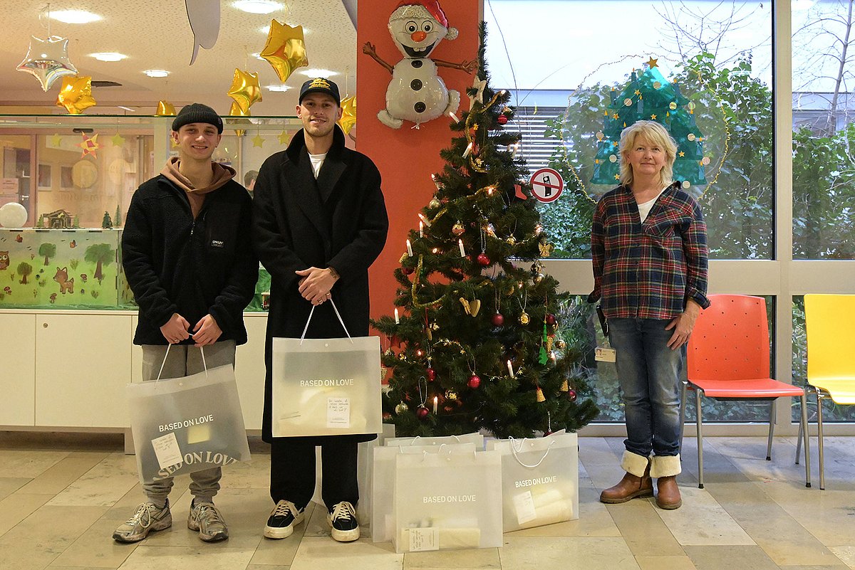„Wir möchten den Kindern und Jugendlichen, die Weihnachten im Krankenhaus verbringen müssen, eine Freude und vor allem Mut machen“, brachte Maximilian Wiesent seine Motivation auf den Punkt. Der Geschäftsführer des Bayreuther Modelabels „Based on Love“ überreichte zusammen mit Elias Klug, Foto- und Videograf des Labels, mehrere Tüten voller Kleidungsstücke an Marion Müller, leitende Erzieherin der Kinder- und Jugendklinik (Direktor: Prof. Dr. Joachim Wölfle) des Uniklinikums Erlangen. Die beiden jungen Männer hatten vorher die Kleidergrößen abgefragt und entsprechende Sets liebevoll zusammengestellt.