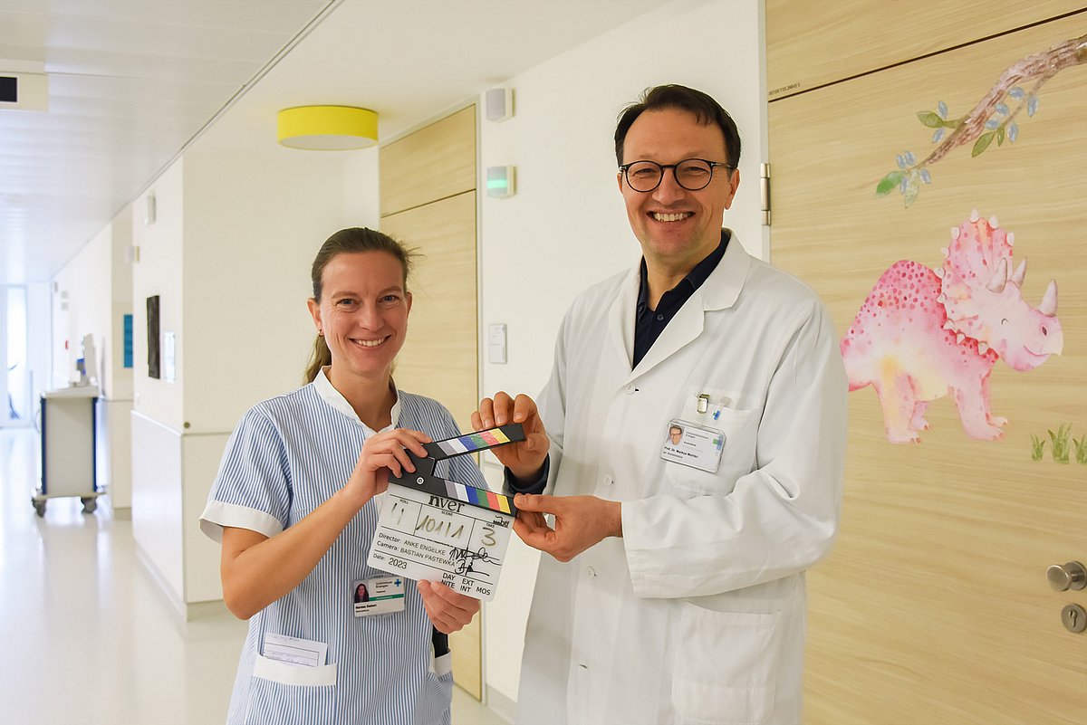 „Das ist eine tolle Möglichkeit, um uns bei der Kinderklinik zu bedanken“, sagten die Eheleute Beier, als ihnen die Filmklappe am Uniklinikum Erlangen überreicht wurde. „Unser Sohn wurde 2019 im Alter von vier Monaten in der Kinderklinik am Herzen operiert. Die Ärztinnen und Ärzte und das Behandlungsteam auf der Station waren super!“ Aus diesem Grund hatte die 37-jährige Herzogenauracherin sich dazu entschlossen, mitzubieten. „Eigentlich habe ich die Filmklappe für meinen Mann ersteigert, der ein großer Fan von Bastian Pastewka ist. Neben meinem Gebot wurden 49 weitere abgegeben und ich habe mich wirklich sehr gefreut, dass ich am Ende die Höchstbietende war.“