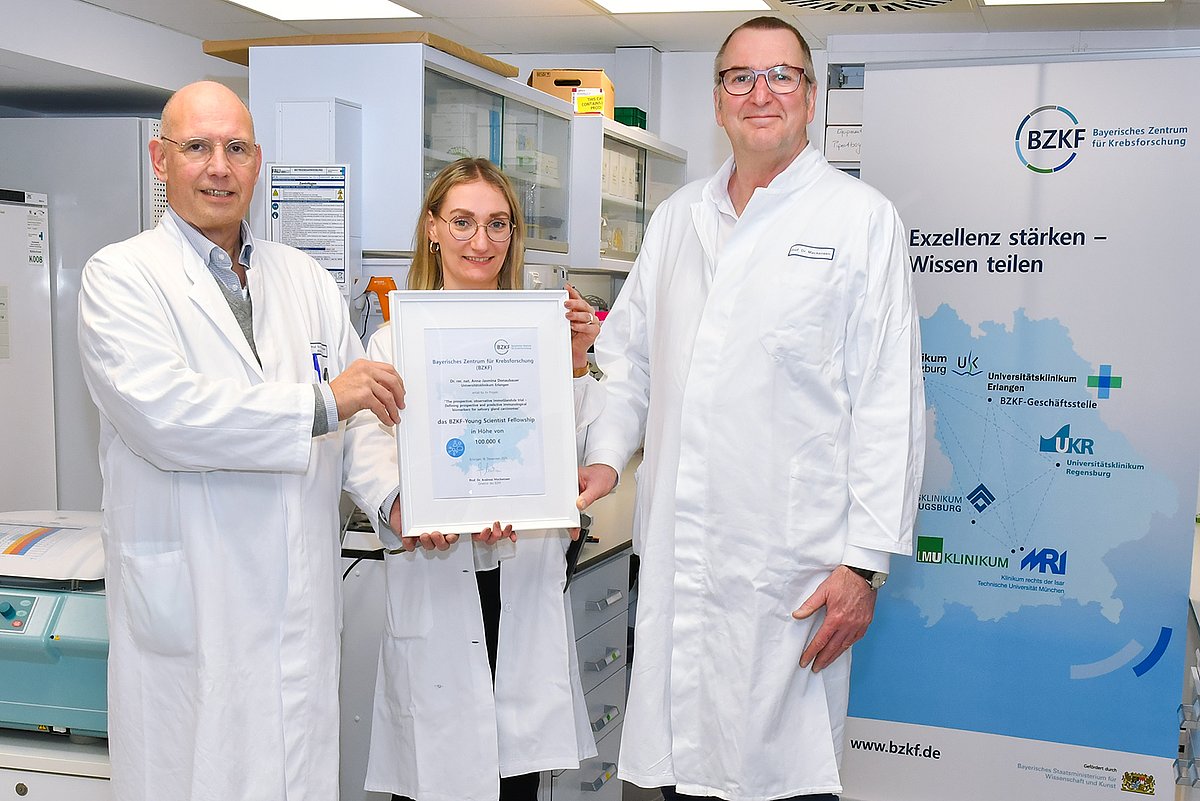 Bei der Urkundenübergabe (v. l. n. r.): Prof. Dr. Matthias W. Beckmann (Mitglied des BZKF-Direktoriums und Direktor des CCC Erlangen-EMN), Preisträgerin Dr. Anna-Jasmina Donaubauer und Prof. Dr. Andreas Mackensen (Direktor des BZKF). Foto: Simon Krikava/Uniklinikum Erlangen