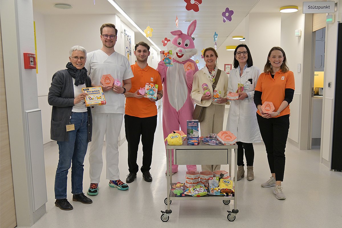 Emre Dinc, Michele Ficucella und Leonie Schaeff von der Firma Sixt brachten für sie jetzt süße Osterleckereien im „Sixt-Design“ vorbei. Gisela Sieber von der Simba Dickie Group ergänzte diese noch um verschiedene Spielsachen für kleine und größere Kinder. Über die Geschenke freuen dürfen sich die Patientinnen und Patienten der Station 3C der Kinderklinik. Hier werden allgemein-pädiatrische Krankheitsbilder behandelt, u. a. neuropädiatrische und Stoffwechselerkrankungen. Prof. Dr. Regina Trollmann, Oberärztin und ärztliche Leiterin der Station 3C, Helga Bieberstein, Pflegedienstleitung der Kinderklinik, und Marc Knoll, stellvertretende Stationsleitung, nahmen die Spende entgegen. „Wir sind sehr dankbar für die tollen Geschenke, weil sie insbesondere die Patientinnen und Patienten aufmuntern, die die Osterfeiertage hier bei uns verbringen müssen. Es freut mich besonders, dass Sie auch an Kinder und Jugendliche mit neurologischen Erkrankungen denken, die oft einen langen Leidensweg hinter sich haben“, sagte Prof. Trollmann.