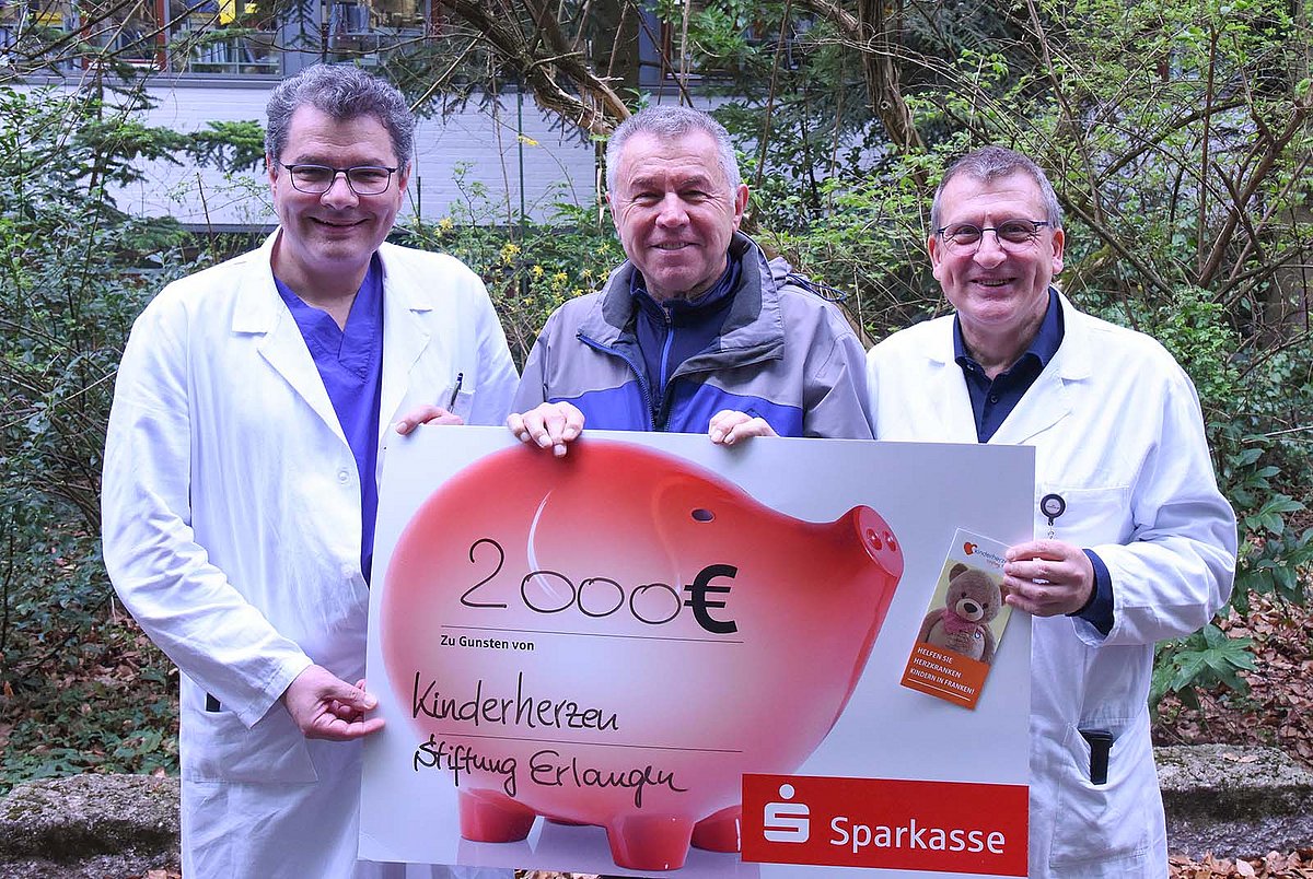 „Mir geht es gut und ich habe alles, was ich brauche“, sagte Harald Jahreis bei der Übergabe seines Spendenschecks an Prof. Dr. Oliver Dewald, Direktor der Herzchirurgischen Klinik des Uniklinikums Erlangen, und Prof. Dr. Sven Dittrich, Leiter der Kinderkardiologischen Abteilung des Uniklinikums Erlangen. Gemeinsam engagieren sie sich als Sprecher des Kuratoriums der neu gegründeten „kinderherzen Stiftung Erlangen“ – einer Regionalstiftung des kinderherzen e. V. in Bonn. Für seine Spende in Höhe von 2.000 Euro verzichtete Harald Jahreis auf jegliche Geschenke anlässlich seines 70. Geburtstags. „Ich wünsche mir nur, dass das Geld herzkranken Kindern hilft und ihnen ihr Leben schöner macht“, so der Jubilar. „Gesundheit ist immer etwas Ganzheitliches, und mit dieser hohen Spendensumme können wir für die Kinder auf unseren Stationen viel erreichen“, bedankte sich Prof. Dittrich, und Prof. Dewald ergänzte: „Wir unterstützen damit etwa innovative Lichtkonzepte, die die Heilungsprozesse beschleunigen, oder ermöglichen Kindern mit kiloschweren Kunstherzen mehr Mobilität.“