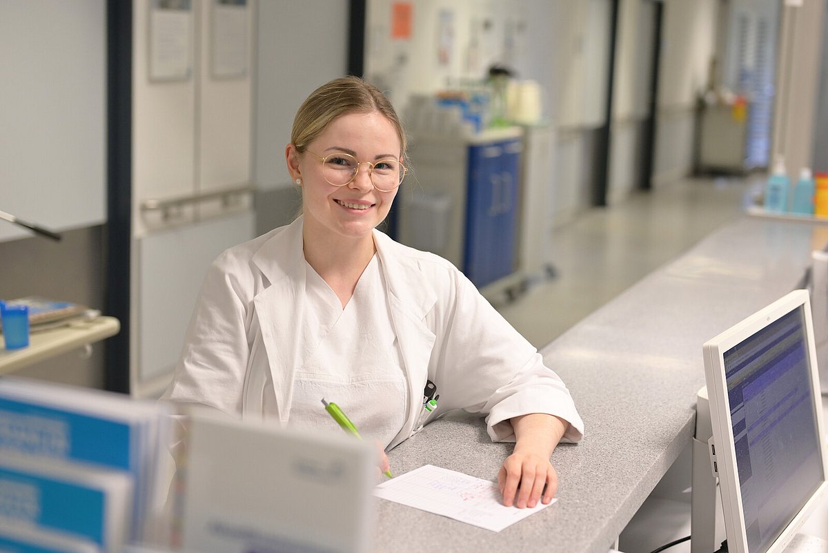„Ich mag eigentlich alle meine Aufgaben. Die Abwechslung gefällt mir an dem Beruf besonders gut“, sagt die Physician Assistant. „Im Nachhinein bin ich gar nicht böse, dass das mit dem Medizinstudium nicht geklappt hat.“ Ihre ärztlichen Kolleginnen und Kollegen auf Station schätzen es sehr, dass sie bei den täglichen Aufgaben unterstützt. „PAs sind sozusagen die Vertretung für uns, denn Larisa ist immer bei der Visite dabei und bekommt alles mit. Auch wenn die Pflege mal nicht präsent sein kann, ist unsere PA immer ansprechbar. Sie bildet die Brücke zwischen den beiden Disziplinen“, betont die Ärztin Dr. Pamela Heiland. Bevor sie ans Uniklinikum Erlangen kam, machte sie in Freiburg bereits viele gute Erfahrungen mit dem Beruf Physician Assistant. Ihr Kollege Tim Vladimirov pflichtet ihr bei: „Wir merken, wenn unsere PA nicht da ist“, sagt er und lacht. „Sie hat den Überblick über alle Patientinnen und Patienten und Aufgaben auf Station. Larisa spart uns allen Zeit – dem Ärzteteam, den Patienten und deren Angehörigen. Dadurch ist sie eine echte Entlastung.“
