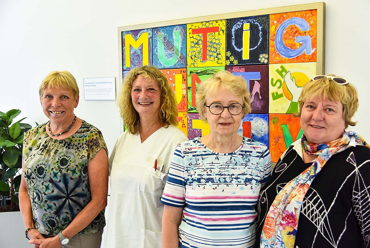 Mit Pinseln und Farben, aber auch Federn und Graffiti-Spraydosen gestalteten insgesamt zwölf Frauen unter der Anleitung von Martina Dorsch je einen der bunten Buchstaben. Anschließend wurden die einzelnen Elemente zu einem großformatigen Bild zusammengefügt. „Als wir alle Buchstaben das erste Mal nebeneinander aufgestellt haben, waren wir unfassbar stolz“, erinnert sich Martina Dorsch. Die Erlanger Frauenselbsthilfe Krebs spendete nicht nur die Materialien für das Kunstprojekt, sondern übernahm auch das Einrahmen des fertigen Kunstwerks, das jetzt im Gang der onkologischen Tagesklinik der Frauenklinik des Uniklinikums hängt und allen Patientinnen, die es während ihrer Behandlung vor Augen haben, Mut für ihren Kampf gegen den Krebs schenken soll. „Ich kann vor euch und allen anderen krebserkrankten Frauen, denen ich hier begegne, nur den Hut ziehen“, sagte Patientenlotsin Gabriele Littschwager im Gespräch mit den drei FSH-Vertreterinnen. „Ihr seid alle so unglaublich tapfer!“