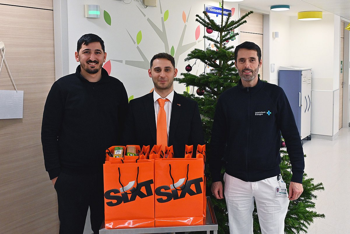 Adventsüberraschung in der Kinderonkologie: Emre Dinc und Michele Ficucella von der Erlanger Filiale der Sixt GmbH & Co. Autovermietung KG haben die Kinderonkologie (Leiter: Prof. Dr. Markus Metzler) der Kinder- und Jugendklinik (Direktor: Prof. Dr. Joachim Wölfle) des Uniklinikums Erlangen besucht. Mit im Gepäck: jede Menge Geschenktüten, die die Autovermieter persönlich im Beisein von PD. Dr. Axel Karow, Oberarzt in der Kinderklinik, an die jungen Patientinnen und Patienten auf der Station verteilten. Für die Beschenkten war der Besuch eine schöne Abwechslung vom Klinikalltag. Neben den Weihnachtsüberraschungen freuten sich die Kinder und ihre Familien auch über die Anteilnahme der Sixt-Mitarbeiter.