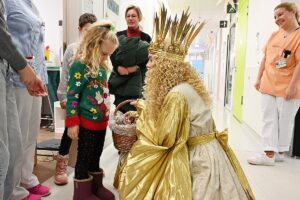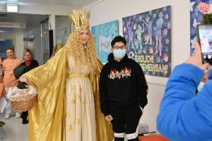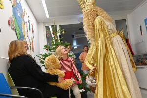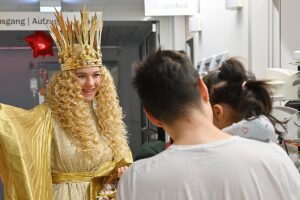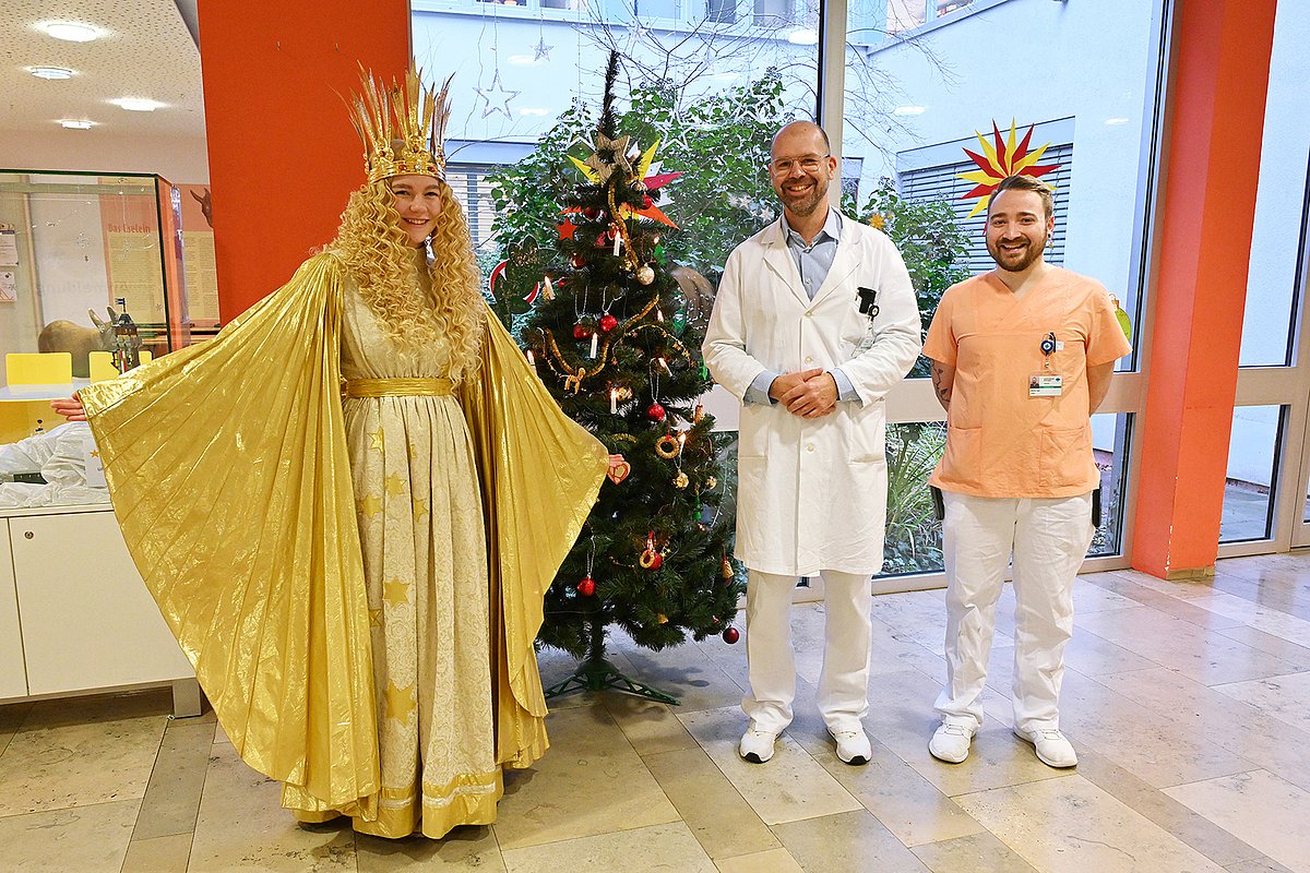 Ein weiterer Höhepunkt der vorweihnachtlichen Veranstaltungen war der alljährliche Besuch des Nürnberger Christkinds. Im traditionellen Sternengewand und mit goldener Lockenpracht lief die 18-jährige Nelli Lunkenheimer über die Stationen und wünschte allen Patientinnen und Patienten ein schönes Fest und gute Genesung. Die kleinen und großen Bewunderer wurden mit selbst gemachten Glückssternen beschenkt, konnten dem Weihnachtsengel einmal selbst „Hallo“ sagen oder ihm sogar noch einen Wunschzettel zustecken.
