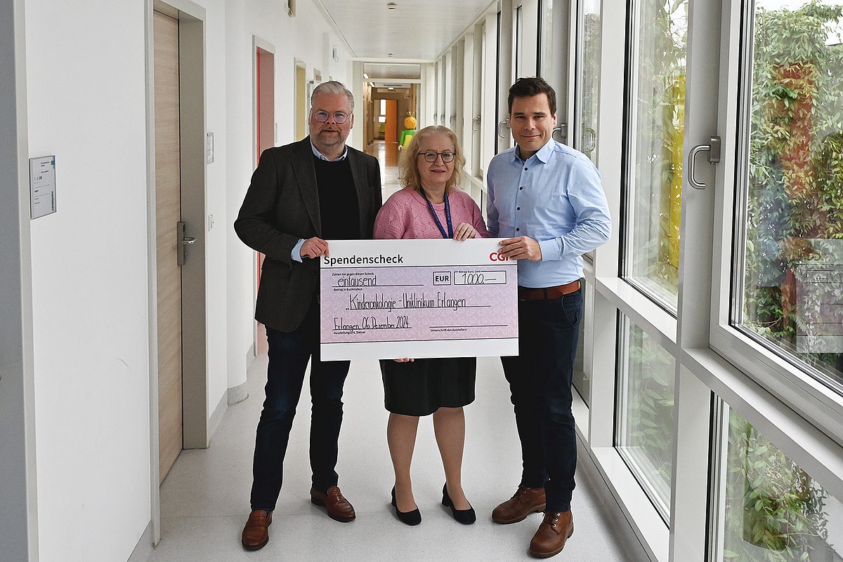 Am Ende jedes Jahres stimmen die Mitarbeitenden der Niederlassungen des IT-Unternehmens CGI Deutschland B.V. & Co. KG über den Empfänger einer wohltätigen Spende ab. Die Zweigstelle der Europäischen Metropolregion Nürnberg entschied sich für eine Zuwendung an das Kinderpalliativzentrum des Uniklinikums Erlangen. Fabian Schneider, Leiter von CGI in Erlangen, sowie Sebastian Gerling, Vice President von CGI in München, übergaben nun den Spendenscheck in Höhe von 1.000 Euro an Dr. Chara Gravou-Apostolatou, Sprecherin des Kinderpalliativzentrums.