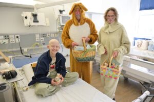 Süße Nougateier, goldglänzende Schokohasen, Bilderbücher und mehr brachten die fünf Hasen für die Kinder und Jugendlichen auf den Stationen der Kinderklinik mit. Die Freude bei den anwesenden Eltern, Patientinnen und Patienten war groß. Es wurden Erinnerungsfotos geschossen und eine Mutter kommentierte ganz überrascht: „Ach, wie schön, dass wir das heute mitkriegen!“, während ihr Sohn auf ihrem Schoß bereits ein großes Schoko-Osterei auswickelte.