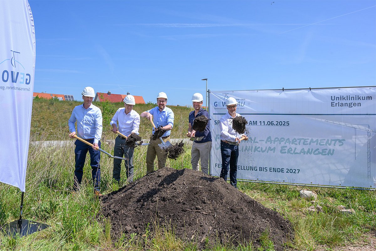 Mit einem gemeinsamen Projektauftakt vor Ort geben die Vertreter der GEWOBAU Erlangen, die Stadt Erlangen und das Universitätsklinikum Erlangen den Startschuss für ein zukunftsweisendes Wohnprojekt. An der künftigen Adresse Walberlaweg 2–4 im Stadtteil Büchenbach entstehen bis Ende 2027 insgesamt 88 Appartements für Mitarbeitende des Universitätsklinikums.