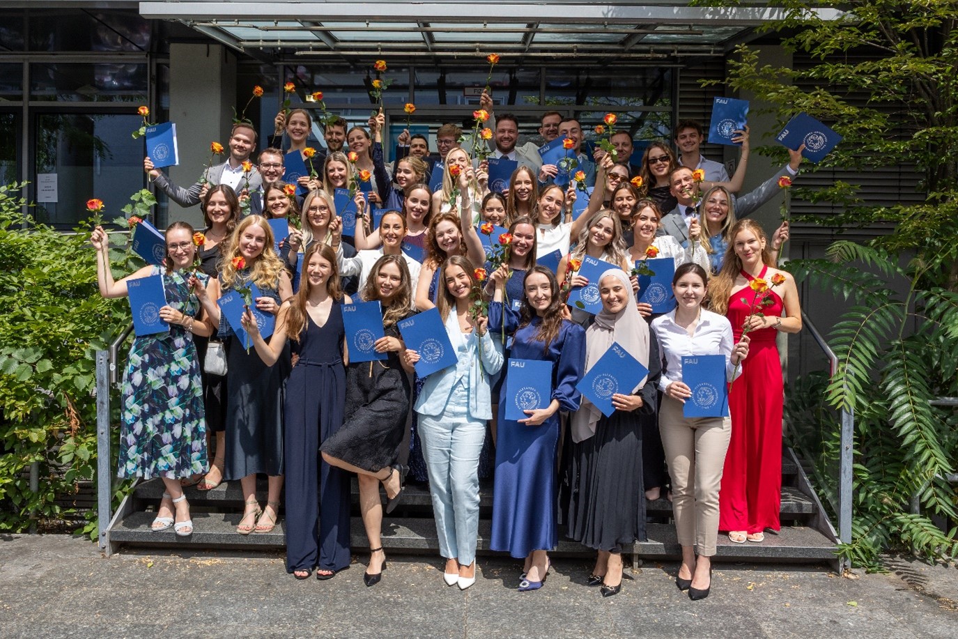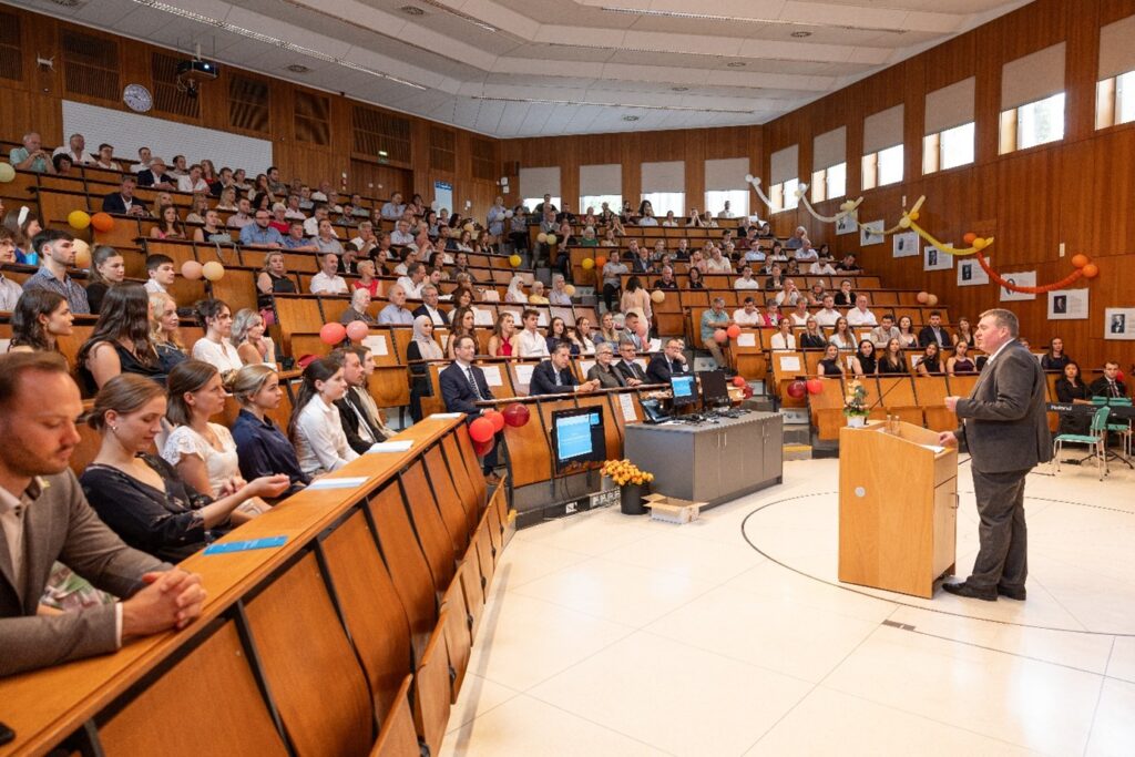 Am 5. Juli 2025 verabschiedete die Medizinische Fakultät der Friedrich-Alexander-Universität Erlangen-Nürnberg zum ersten Mal seit mehreren Jahrzehnten ihre Zahnmedizin-Absolventinnen und -Absolventen in einer offiziellen akademischen Examensfeier. Unter dem Motto „Golden Hour“ erlebten 41 frisch Examinierte gemeinsam mit rund 300 Gästen einen emotionalen und feierlichen Abschied von ihrer Studienzeit. Im festlich geschmückten Hörsaal der Östlichen Stadtmauerstraße eröffnete Studiendekan Prof. Dr. Volk die Veranstaltung. Das Motto „Golden Hour“ zog sich als roter Faden durch den Tag – symbolisch für einen goldenen Übergang vom Studium ins Berufsleben, musikalisch interpretiert und emotional spürbar. In seiner inspirierenden Festrede verknüpfte Prof. Dr. Dr. Lutz, stellvertretender Direktor der Mund-Kiefer- und Gesichtschirurgischen Klinik, das Phänomen der „Goldenen Stunde“ in der Fotografie mit den besonderen Momenten des Wandels im Leben – und schenkte den Absolventinnen und Absolventen eindrucksvolle Impulse für den neuen Lebensabschnitt.