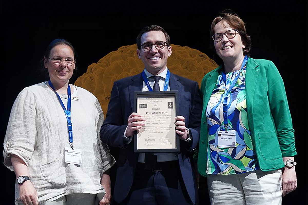 Strahlentherapie bei Hirntumoren zukünftig noch effektiver und nebenwirkungsärmer gestalten – dieses Ziel verfolgt PD Dr. Florian Putz, Oberarzt der Strahlenklinik (Direktor: Prof. Dr. Rainer Fietkau) des Uniklinikums Erlangen mit seiner Forschungsarbeit zur KI-gestützten Zielvolumenkonturierung von malignen Gliomen. Hierfür hat der Erlanger Wissenschaftler eine KI-basierte Methode entwickelt, mittels der mikroskopische Tumorinfiltration von gesundem Hirngewebe abgegrenzt werden kann – und zwar automatisiert, schneller und präziser als mit herkömmlichen Methoden. Die Vorteile für Patientinnen und Patienten sind eine optimierte Strahlendosis, geringere Nebenwirkungen und eine höhere Behandlungssicherheit. Angesichts der herausragenden Bedeutung der Studie für die zukünftige Strahlenforschung und -therapie wurde PD Putz nun auf dem 31. Jahreskongress der Deutschen Gesellschaft für Radioonkologie e. V. (DEGRO) mit dem renommierten Koester-Preis ausgezeichnet.
