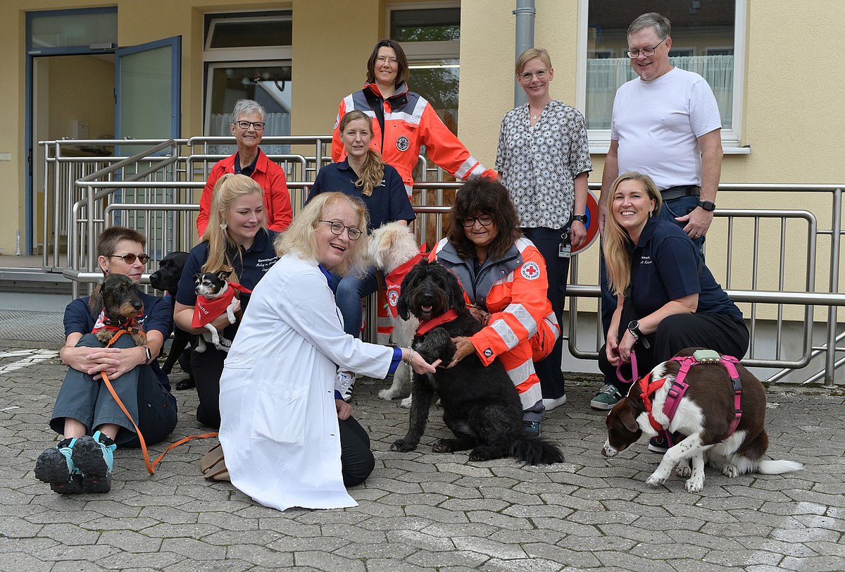 Mischlingshündin Sina gab Dr. Chara Gravou-Apostolatou ihre Pfote – damit war die neue Kooperation zwischen dem Bayerischen Roten Kreuz – Kreisverband Erlangen-Höchstadt und dem Kinderpalliativteam des Uniklinikums Erlangen besiegelt. „Wir freuen uns sehr auf die Zusammenarbeit“, sagte Dr. Gravou-Apostolatou, Sprecherin des Kinderpalliativzentrums, beim offiziellen Startschuss. Sina, Chico, Fritzi und neun weitere Vierbeiner haben ihre roten Halstücher angelegt und sind bereit: Künftig werden die Besuchshunde des BRK Erlangen-Höchstadt die schwer kranken Patientinnen und Patienten des Erlanger Kinderpalliativteams zu Hause in ihrer gewohnten Umgebung besuchen. „Wir wollen das allen Patientinnen und Patienten ermöglichen, die sich Kontakt zu einem Tier wünschen“, erklärte Dr. Gravou-Apostolatou weiter. „Das jeweilige Zweierteam aus Hund und Halterin oder Halter wird uns dann bei unseren Hausbesuchen begleiten.“