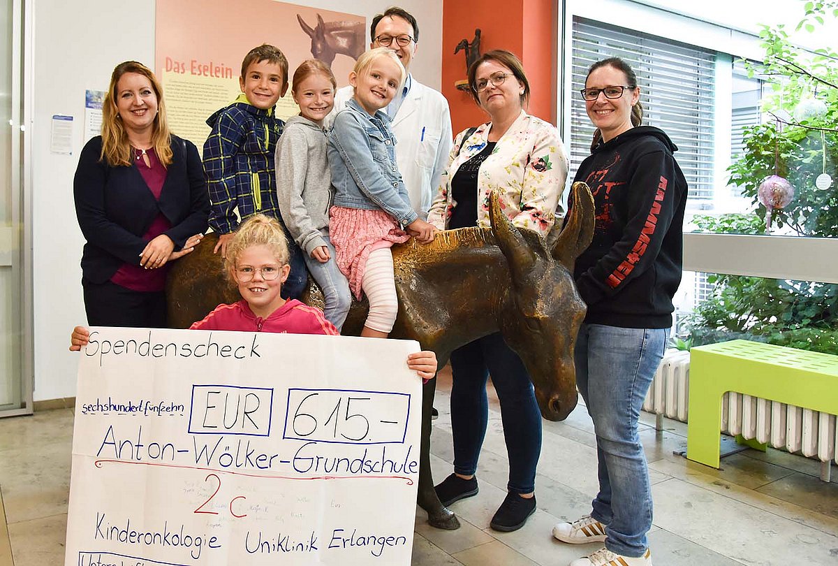 Ausrangiertes Spielzeug, Malutensilien sowie überzählige Brett- und Kartenspiele – die Kinder der Klasse 2c an der Anton-Wölker-Grundschule in Höchstadt hatten sich von vielen Spielsachen getrennt und diese auf dem Schulfest zugunsten krebskranker Kinder verkauft. Eine kleine Abordnung der Schülerinnen und Schüler übergab jetzt gemeinsam mit der Klassenlehrerin Helen Friedel einen symbolischen Spendenscheck über 615 Euro an Prof. Dr. Markus Metzler, Leiter der Kinderonkologie des Uniklinikums Erlangen, der sich herzlich für die engagierte Spendenaktion bedankte. „Dieses Verständnis für die Belastungen krebskranker Kinder und Jugendlicher und euer tatkräftiges Mitgefühl für andere, denen es nicht so gut geht wie euch selbst, freut mich wirklich sehr“, sagte der Kinderonkologe. Der achtjährige Adrian und seine gleichaltrigen Mitschülerinnen Anni, Sarah und Stella hatten auch gleich eine Idee, wie das Geld investiert werden soll: „Am besten für schönes Spielzeug, damit das Kranksein für die Kinder nicht mehr ganz so schlimm ist.“