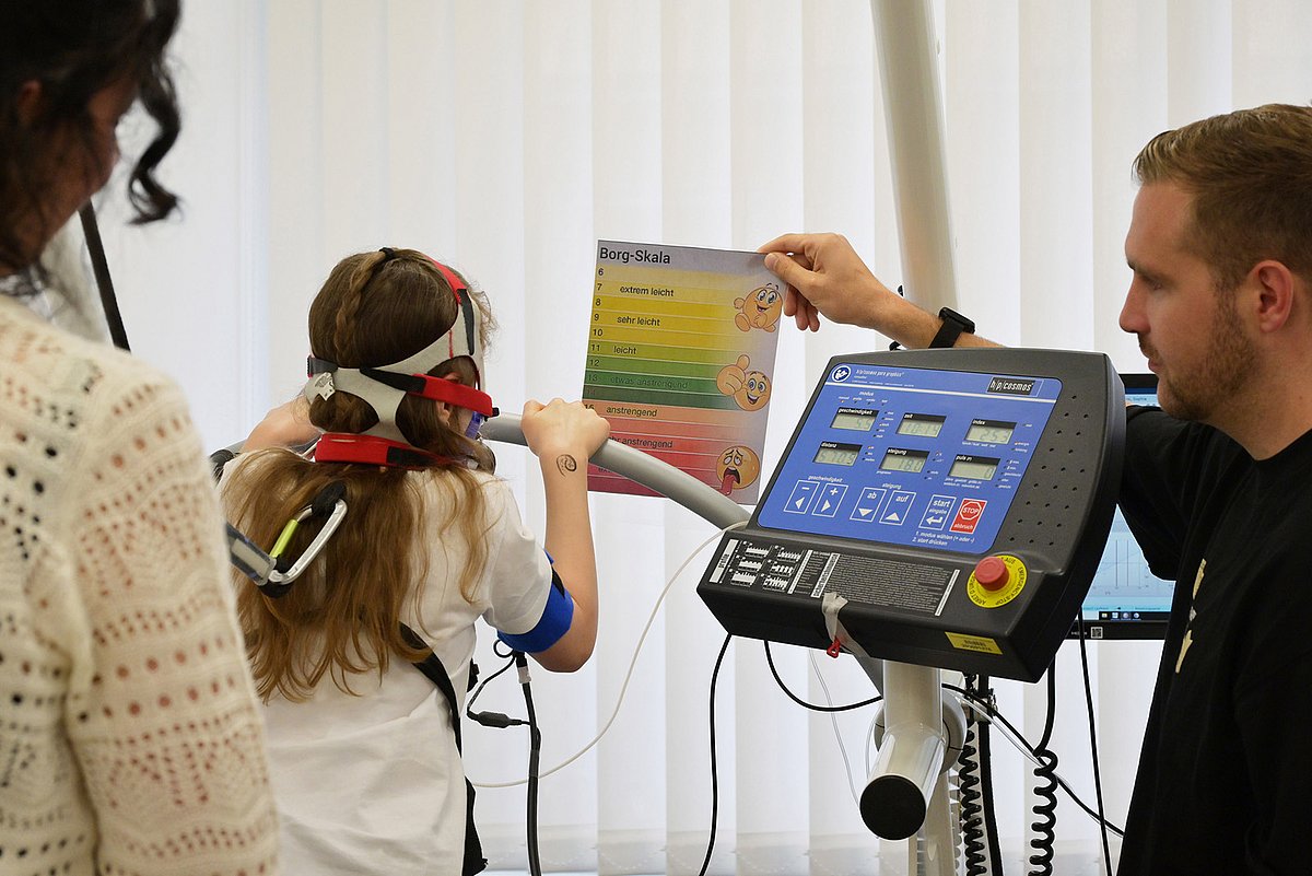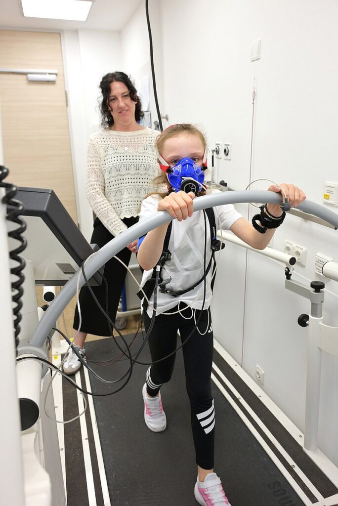 Sportwissenschaftler Nicolas Müller lotet deshalb mit Sophia aus, was noch beziehungsweise was schon wieder möglich ist. Er bereitet sie für eine Spiroergometrie auf dem Laufband vor – eine sportmedizinische Untersuchung von Herz, Lunge und Kreislauf. Dafür legt Nicolas Müller dem Mädchen eine spezielle Atemmaske an, EKG-Elektroden, ein Blutdruck- und ein Sauerstoffmessgerät. „Du läufst ungefähr zwölf Minuten. Dabei wird das Laufband immer steiler, das Tempo schneller“, erklärt er. „Du gibst einfach alles. Es kann nichts passieren.“ Ein Sicherungsseil hält Sophia, sollte sie straucheln. Langsam läuft sie los, beschleunigt, zeigt zwischendurch auf einer farbigen Zahlenskala mehrfach an, wie fordernd es gerade für sie ist. 11 – leicht. 15 – anstrengend. 17 – sehr anstrengend. Sophia geht ins Joggen über, das Laufband zeigt steil bergauf. Die finale Auswertung auf Nicolas Müllers Monitoren beweist: Das Zusammenspiel zwischen Herz und Lunge funktioniert gut, der Kreislauf ist belastbar. „Sie liegt in ihrer Altersklasse über der Norm. Zwar ist sie noch nicht auf dem hohen Niveau von früher, aber sie ist sehr gut“, urteilt der Sportwissenschaftler und rät der Mutter: „Bauen Sie mit ihr intensive 30-sekündige Trainingseinheiten in den Alltag ein – Trampolinspringen, Seilhüpfen, Treppenläufe. Danach eine Minute Pause und noch zwei, drei Durchgänge. Das Ganze zwei- bis dreimal die Woche.“