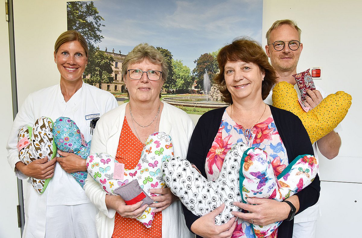 Die stellvertretende Klinikdirektorin, Prof. Dr. Carolin Hack, nahm die selbstgenähten weichen Kissen gemeinsam mit dem Physiotherapeuten Christian Kohl in Empfang. „Wir sind so froh über Ihren unermüdlichen Einsatz“, dankte Prof. Hack den beiden engagierten Frauen und lobte deren nachhaltige Idee, aus den Schnittresten der Herzkissenstoffe die gleichermaßen hilfreichen kleinen Gurt- und Portkissen anzufertigen. „Die Kissen sind nicht nur praktisch, sondern spenden unseren Patientinnen auch viel Trost; gerade, weil es solche liebevoll selbstgenähten Geschenke sind“, betonte die stellvertretende Klinikdirektorin.