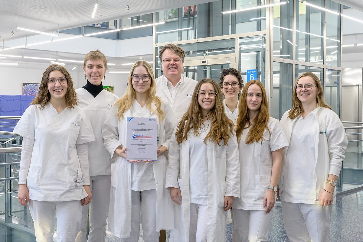 Die Apotheke des Uniklinikums Erlangen, geleitet von Prof. Dr. Frank Dörje, wurde jetzt von der Bayerischen Landesapothekerkammer (BLAK) als „Bayerische Ausbildungsapotheke“ zertifiziert. Das Zertifikat wird seit 2022 an öffentliche Apotheken vergeben und kann seit 2025 erstmals auch von Krankenhausapotheken erworben werden. Teilnehmende Einrichtungen weisen mit dem Zertifikat zunächst für drei Jahre ihre Ausbildungsbefähigung für Pharmazeutinnen und Pharmazeuten im Praktikum im Rahmen der BLAK-Vorgaben nach. Im November 2025 ist die Apotheke des Uniklinikums Erlangen eine von bislang nur 14 gelisteten Krankenhausapotheken in ganz Bayern.