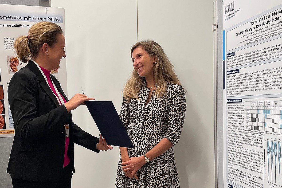 Dr. Louisa Hofbeck, Ärztin an der Frauenklinik (Direktor: Prof. Dr. Matthias W. Beckmann) des Uniklinikums Erlangen, wurde für ihre aktuelle wissenschaftliche Arbeit mit einem Posterpreis ausgezeichnet. Die angehende Gynäkologin erhielt die Ehrung im Rahmen des 16. Endometriosekongresses deutschsprachiger Länder Mitte November in Freiburg. Prämiert wurden nur drei der über 50 eingereichten Abstracts. In ihrer Studie „Von der Klinik zum Phänotyp: Charakterisierung endometriosetypischer Erscheinungsbilder“ untersuchte Dr. Hofbeck gemeinsam mit einem Team des Universitäts-Endometriosezentrums Franken (Sprecher: Prof. Dr. Matthias W. Beckmann), welche Beschwerden bei den verschiedenen Erscheinungsformen der Endometriose auftreten und mit welcher Intensität die Symptome von Frau zu Frau variieren können. Die Ergebnisse helfen nun dabei, Beschwerden besser einzuordnen und die Therapie individueller auf die Patientinnen abzustimmen – sei es medikamentös, operativ oder im Rahmen einer multimodalen Behandlung.