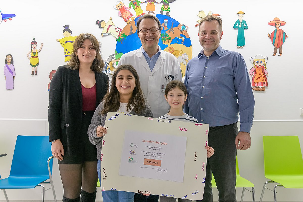 „Alles ganz schön Müll“: Unter diesem Motto stand die Jahresaktion 2024/25 der Kindertagesstätte „Villa Kunterbunt“ in Fürth-Dambach. In unterschiedlichen Projekten beschäftigten sich die 50 Kinder intensiv mit dem Thema Nachhaltigkeit – auch äußerst kreativ. So entstanden einzigartige Kunstwerke aus Materialien, die eigentlich in der Mülltonne oder auf dem Recyclinghof gelandet wären. Diese Meisterstücke wurden dann von den Mädchen und Jungen im Rahmen einer selbst organisierten Ausstellung mit Auktion präsentiert und versteigert. Dabei kamen 1.403 Euro zusammen, die zwei junge Vertreterinnen nun an Prof. Dr. Markus Metzler, Leiter der Kinderonkologie in der Kinder- und Jugendklinik des Uniklinikums Erlangen, überreichten. „Aus Müll Gold machen – das ist ja fast wie im Märchen!“, staunte Prof. Metzler angesichts der stolzen Summe.