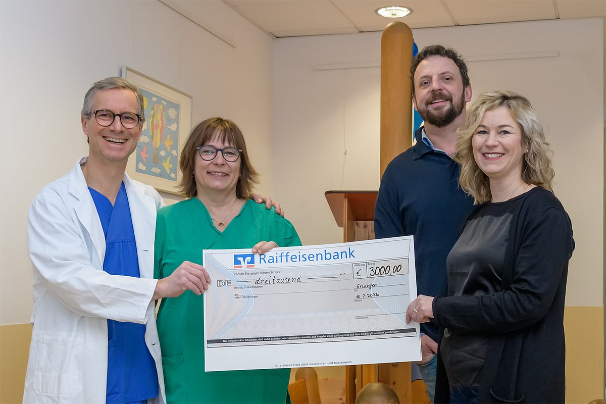 Dass so eine stolze Summe herauskommen würde, überraschte nicht nur das Ehepaar Daniel, sondern auch Prof. Dr. Heiko Reutter, Leiter der Fachabteilung für Neonatologie und Pädiatrische Intensivmedizin. „Durch die ständige Verbesserung moderner neonatologischer Therapieverfahren haben wir die Versorgung unserer Frühgeborenen in Erlangen in den vergangenen Jahren stetig verbessert. Trotzdem sind wir unendlich dankbar für solche Spenden, die uns ganz konkret helfen“, betonte er, als er gemeinsam mit Stationsleitung Katrin Klein den symbolischen Scheck entgegennahm. „Diese Spenden erlauben es uns, Dinge zu finanzieren, die im Erlösbudget nicht abgebildet sind, zum Beispiel die Organisation von Informationsveranstaltungen für betroffene Eltern oder eine Verbesserung der Räumlichkeiten und der Ausrüstung für das Reanimationstraining unseres Fachpersonals.“