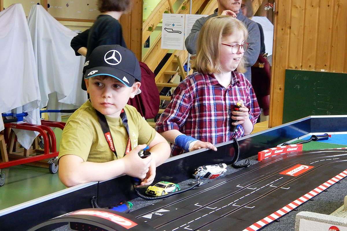 Er ist 2,3 Kilometer lang, verläuft über acht Kurven und wird jedes Jahr im Juli vor der Zeppelinhaupttribüne auf dem ehemaligen Reichsparteitagsgelände aufgebaut: der Stadtkurs des bekannten Nürnberger Norisringrennens. Nun war die Autorennstrecke vor Kurzem auch in der Kinder- und Jugendklinik des Uniklinikums Erlangen zu finden – und zwar als maßstabsgetreues Carrera-Bahn-Modell. Denn: Der Herzo Racing e. V. besuchte die jungen Patientinnen und Patienten, die dort in Behandlung sind, für einen Nachmittag mit seinem mobilen Nachbau inklusive Grundig-Kehre, Schöller-S, Dutzendteich-Kehre und Steintribüne. In zahlreichen Rennen gingen die Kinder gemeinsam mit ihren Eltern und Geschwistern, aber auch mit Pflegefachkräften und anderem medizinischen Personal an den Start – und hatten dabei sichtlich Spaß. Organisiert wurde das Event vom Verein in enger Zusammenarbeit mit dem Erzieherinnenteam der Kinderklinik.