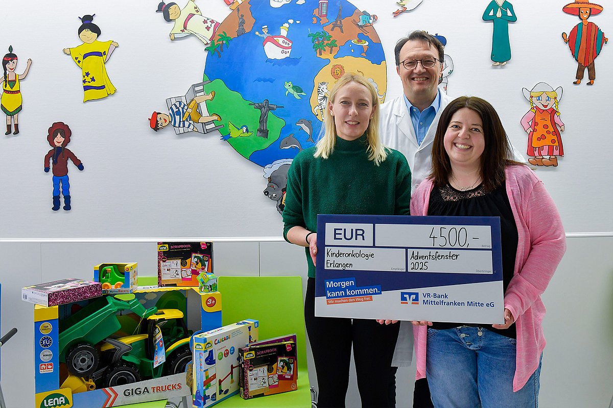 Mit viel Fantasie und Hingabe haben die Dorfgemeinschaften von Eckersmühlen und Hofstetten südlich von Roth im Advent Spenden für die Fachabteilung Pädiatrische Onkologie und Hämatologie der Kinderklinik des Uniklinikums Erlangen gesammelt. Insgesamt kamen bei der Aktion 4.500 Euro zusammen, die die Organisatorin Carina Hanke und ihre Mitstreiterin Nicole Stengl jetzt dem Leiter der Kinderonkologie, Prof. Dr. Markus Metzler, übergaben. Mit im Gepäck hatten sie zusätzlich einige Sachspenden, die die im Ort ansässige SIMM Spielwaren GmbH zur Verfügung stellte.